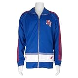 True champions wear the blue and red, so show your Jayhawker pride with the adidas Jayhawk Team Jacket. Features full zip front and zip pockets. "Kansas" across the shoulders and Jayhawk logo on left hip. "KU" lettering on chest, and adidas trefoil logo on right hip. Traditional three-stripes logo runs both sleeves. 55/45 poly/cotton blend.