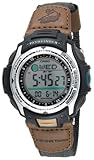The Casio Forester moon phase fishing watch is the perfect timepiece for avid anglers, with a stylish design well suited for both land and sea wear. In addition to the automatic time, day, month and date displays, this convenient digital watch also indicates the best times to fish based on the moon's phase, latitude and longitude. The watch displays the moon's age, phase and time, as well as sunrise and sunset information, for the current or designated day. A handy vibration alert can be used with the daily alarm, hourly time signal, or fishing timer so as not to disturb the quiet on the water. The watch also offers a time memo, a 1/100 second stopwatch, and five daily alarm settings. An automatic electro-luminescent backlight with afterglow makes the display easy to read at any time, and the water-ready nylon band comes with a buckle clasp. The case is made from durable polyurethane resin, the bezel is resin and the watch is water resistant up to 330 feet (100 meters). This watch is backed by a 1-year limited manufacturer's warranty and offers a battery life of approximately five years.