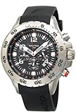 Sporty and stylish: this Nautica watch features a black resin logo strap and stainless steel case. Tachymeter bezel. Black chronograph dial with logo, date window and three subdials. Chronograph movement. Water resistant to 100 meters. Five-year limited warranty.