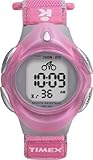 Vibrant-hued and durable, the Timex Kids' IronKids' Pink Watch is a fun accessory to help your keep track of play-dates, dinner time, and other responsibilities. The lightweight digital watch is constructed with a strong resin case, a pink resin bezel, and a comfortable pink nylon band with an adjustable Velcro strap for the perfect fit. A durable mineral window shields the digital-gray dial face, which features the digital time in black. Four easy-to-use start, mode, set, and luminescent buttons are located on the side of the bezel. These buttons allow children to time races and chores, change the watch mode, and illuminate the watch face at night. This digital-quartz-powered watch is water resistant to 150 feet. This watch is backed by a one-year limited manufacturer's warranty.
